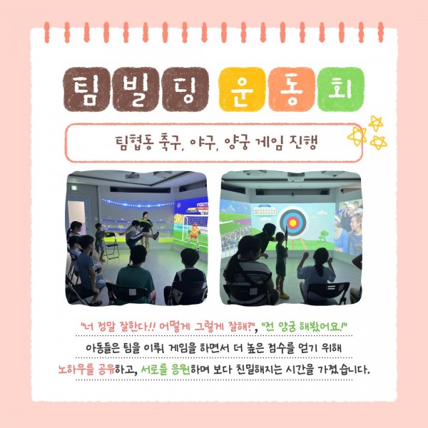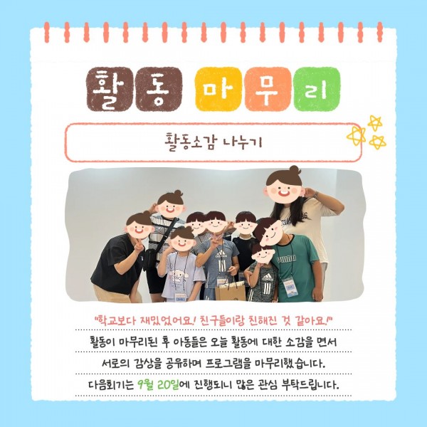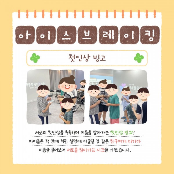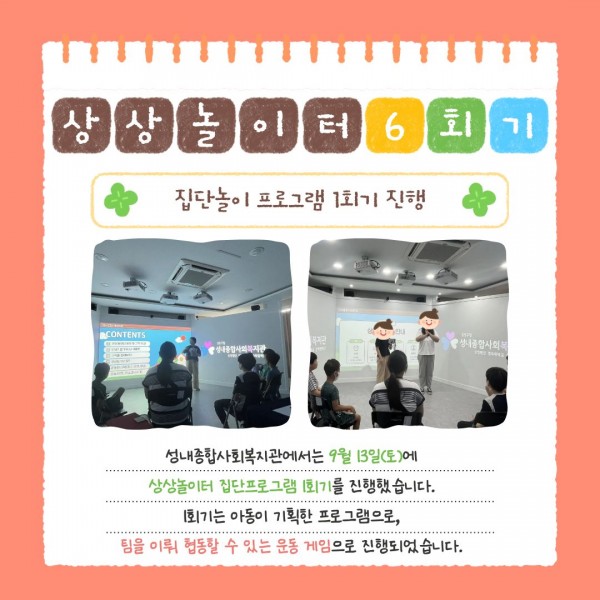 2025년 상상놀이터 집단놀이 프로그램 1회기 진행 페이지 정보 작성자최고관리자 조회조회 : 17회 작성일 25-10-13 15:35 본문 안녕하세요.2025년 9월 13일(토) 성내종합사회복지관에서는관 내 4층 비전상상터에서 상상놀이터 집단놀이 프로그램 1회기를 진행했습니다.자세한 내용은 카드뉴스를 참고해주세요~! 목록