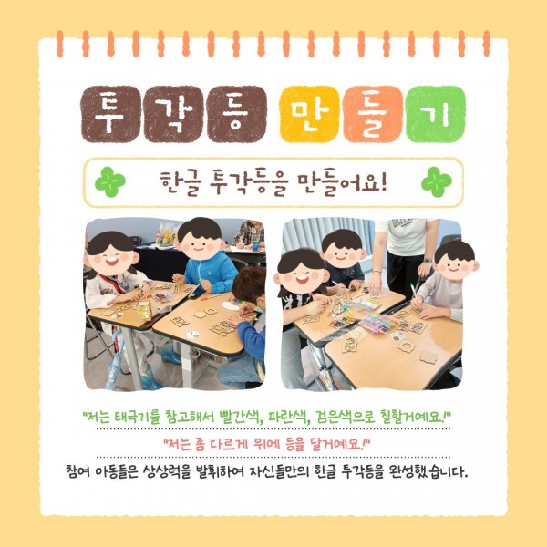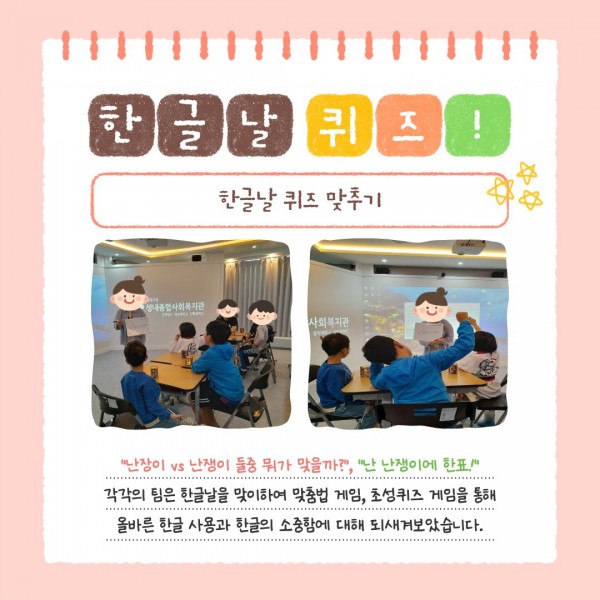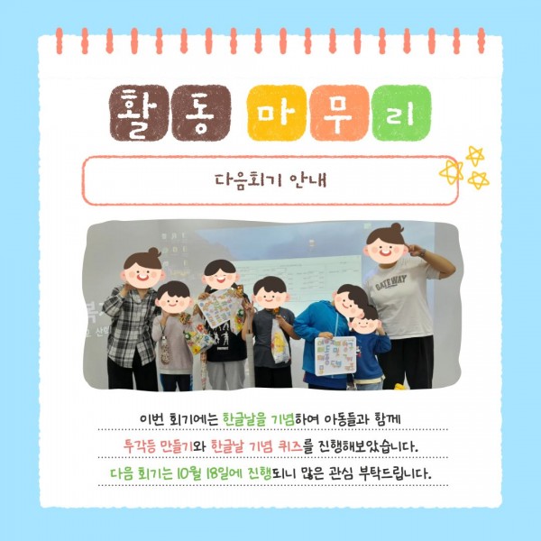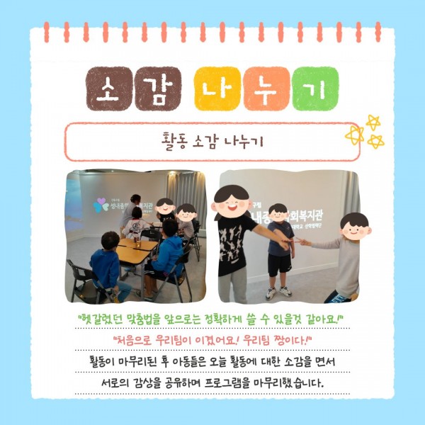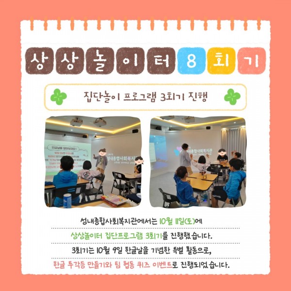 2025년 상상놀이터 집단놀이 프로그램 3회기 진행 페이지 정보 작성자최고관리자 조회조회 : 26회 작성일 25-10-13 16:05 본문 안녕하세요.2025년 10월 11일(토) 성내종합사회복지관에서는관 내 4층 비전상상터에서 상상놀이터 집단놀이 프로그램 3회기를 진행했습니다.자세한 내용은 카드뉴스를 참고해주세요~! 목록