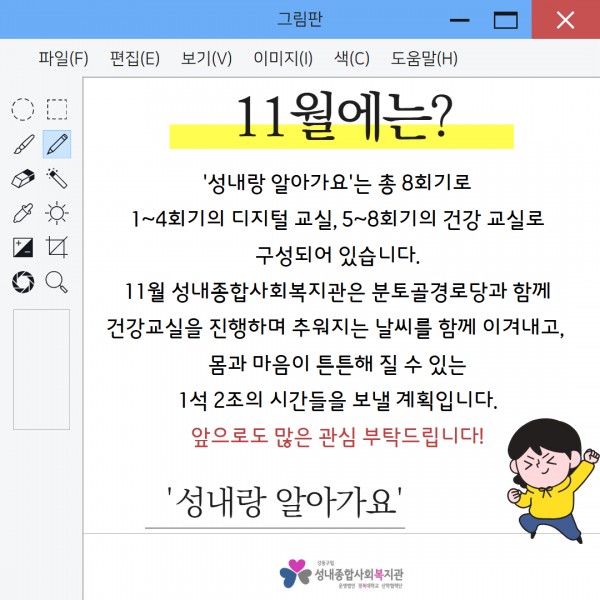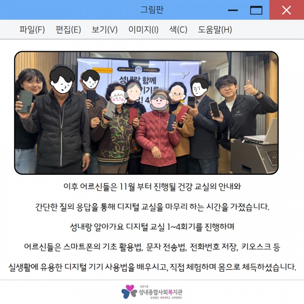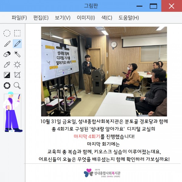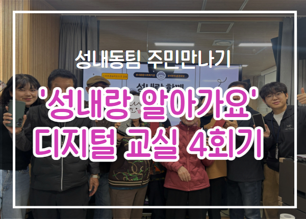 2025년'성내랑 알아가요' 디지털 교실 4회기 진행 페이지 정보 작성자최고관리자 조회조회 : 41회 작성일 25-11-03 15:44 본문 10월 31일 금요일성내종합사회복지관에서는 분토골 경로당과 함께 하는 '성내랑 알아가요' 디지털 교실 4회기를 진행했습니다.자세한 내용은 아래 카드뉴스 확인해주세요:) 목록
