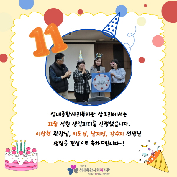 성내종합사회복지관 상조회 2025년 11월 직원 생일파티 페이지 정보 작성자최고관리자 조회조회 : 61회 작성일 25-11-05 14:16 본문 2025년 11월 생일을 맞은 이상현 관장님, 이도경, 남지영, 강수지 선생님 진심으로 축하드립니다! 목록