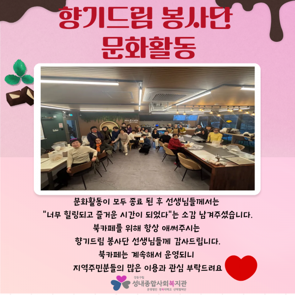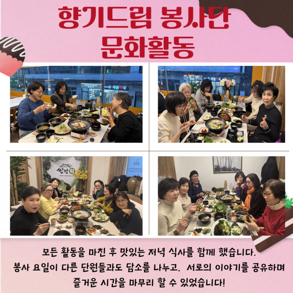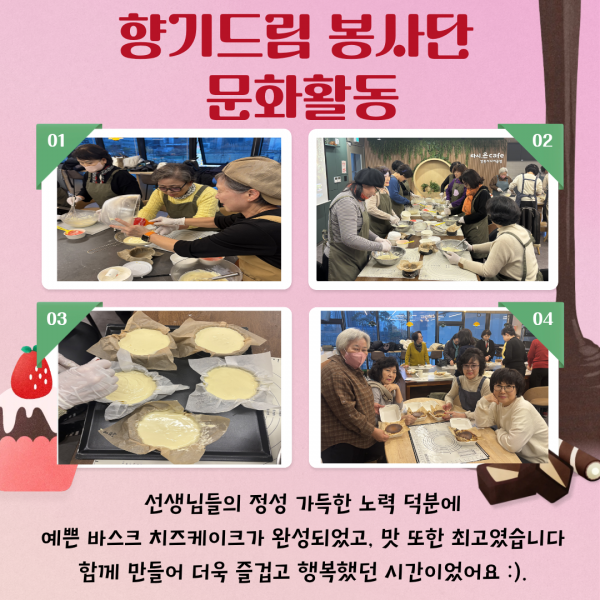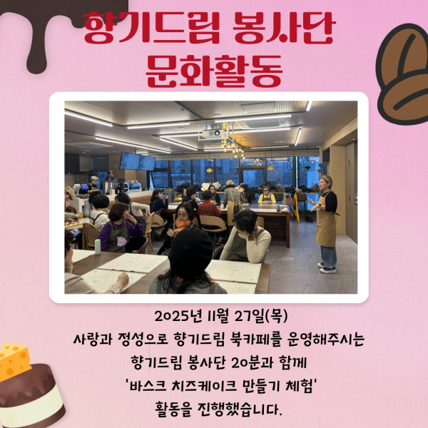 2025년 향기드림 봉사단 문화활동 진행 페이지 정보 작성자최고관리자 조회조회 : 72회 작성일 25-11-27 20:02 본문 2025년 11월 27일(목) 향기드림 봉사단원 20분과 함께 문화활동을 진행했습니다.오랜만에 모두 모여 '바스크 치즈 케이크를' 만들고 식사를 함께 하며 봉사 요일이 다른 봉사단원과도 친밀감을 형성할 수 있는 시간이었는데요~자세한 내용은 아래 카드뉴스를 참고해주세요! 목록