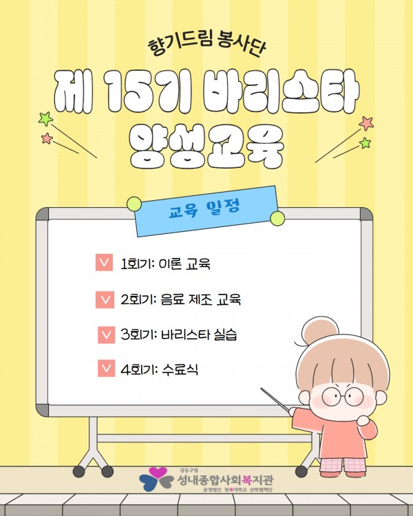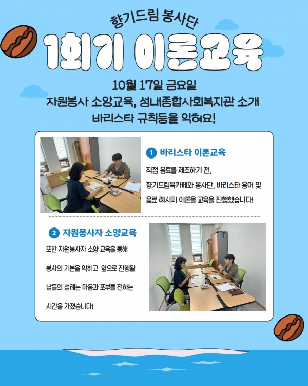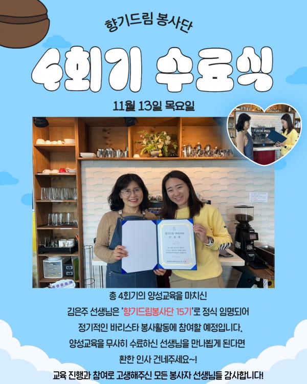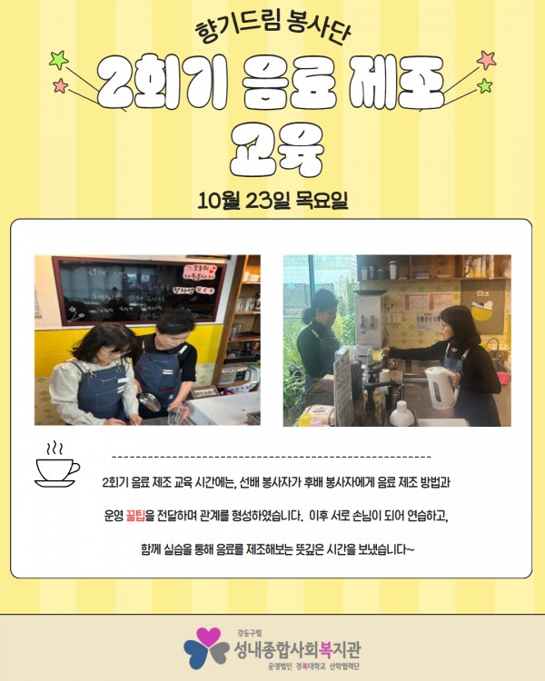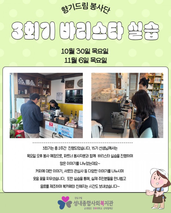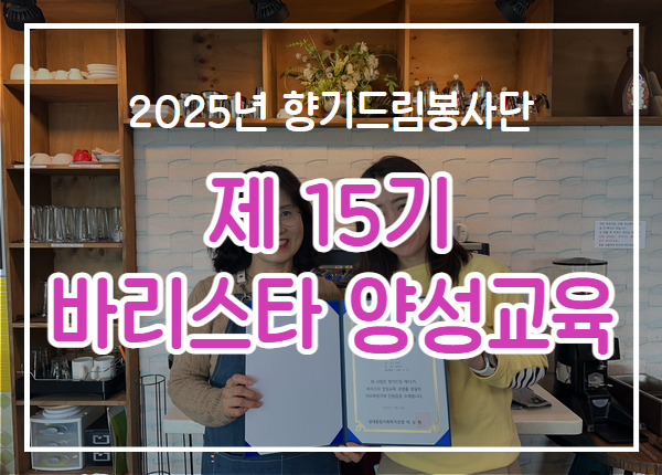 2025년 향기드림봉사단 제 15기 양성교육 진행 페이지 정보 작성자최고관리자 조회조회 : 70회 작성일 25-11-14 14:10 본문 지난 2025년 10월 17일 금요일부터 11월 13일 목요일까지 약 한 달간 향기드림봉사단 제 15기 바리스타 양성교육이 실시되었습니다!교육 수료 후 새롭게 향기드림 봉사단원이 되신 선생님을 만나신다면 환한 인사 건네주세요!자세한 내용은 아래 카드뉴스를 참고해주세요.문의: 070-4164-1211 길동팀 최일환 사회복지사 목록