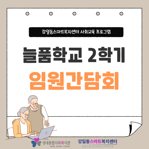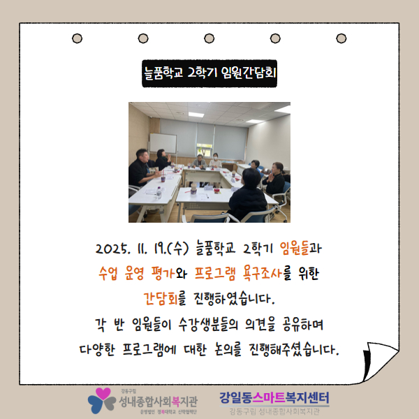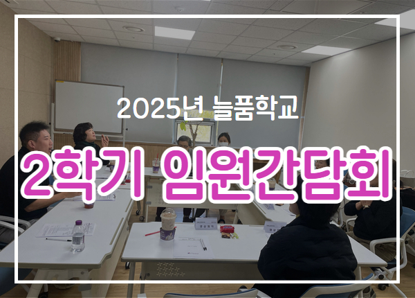 2025년 늘품학교 2학기 임원간담회 진행 페이지 정보 작성자최고관리자 조회조회 : 63회 작성일 25-11-27 18:36 본문 2025년 11월 19일(수) 늘품학교 2학기 임원들과 수업 운영 평가를 위한 간담회를 진행했습니다.자세한 내용은 아래 카드뉴스를 확인해주세요! 목록
