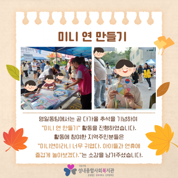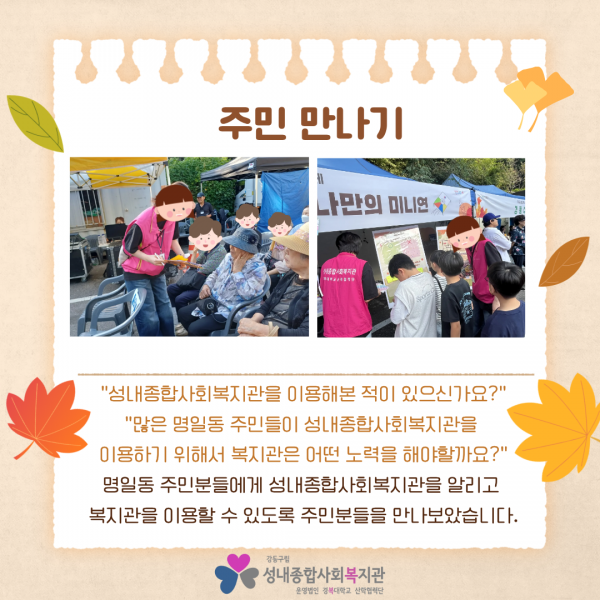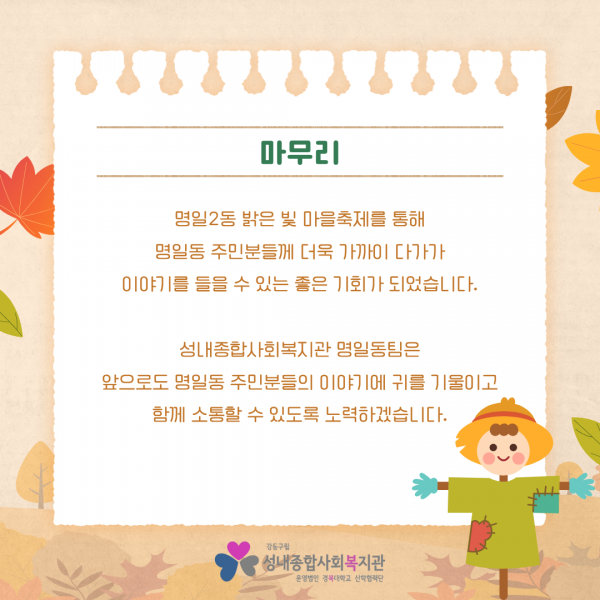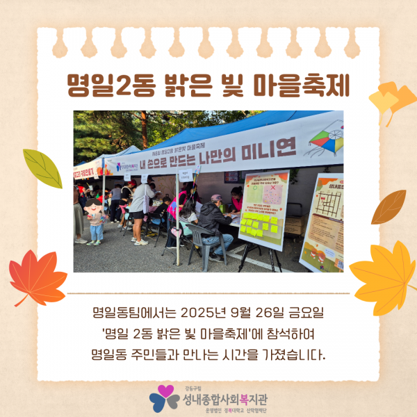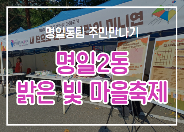 제 8회 명일2동 밝은 빛 마을축제 X 명일동팀 주민만나기 페이지 정보 작성자최고관리자 조회조회 : 93회 작성일 25-10-02 13:51 본문 성내종합사회복지관 명일동팀에서는 제8회 명일2동 밝은 빛 마을축제에 참가하여명일동 주민분들과 소통하는 시간을 가졌습니다!자세한 내용은 아래 카드뉴스를 참고해주세요~! 목록