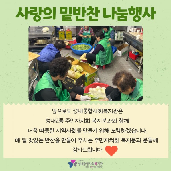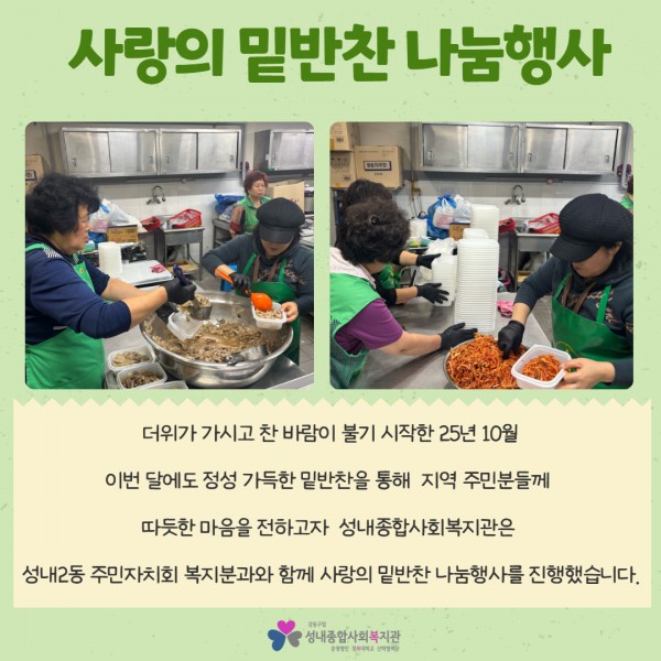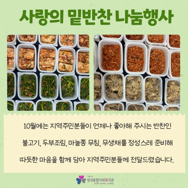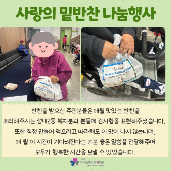 [성내2동 주민자치회 복지분과] 10월 사랑의 밑반찬 나눔행사 진행 페이지 정보 작성자최고관리자 조회조회 : 31회 작성일 25-10-23 18:38 본문 안녕하세요 :)2025년 10월 23일 목요일,총 40분의 지역주민 분들께불고기와 두부조림 등 맛있는 밑반찬 4종이 전달되었습니다.자세한 내용은 아래 카드뉴스를 확인해주세요! 목록