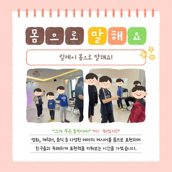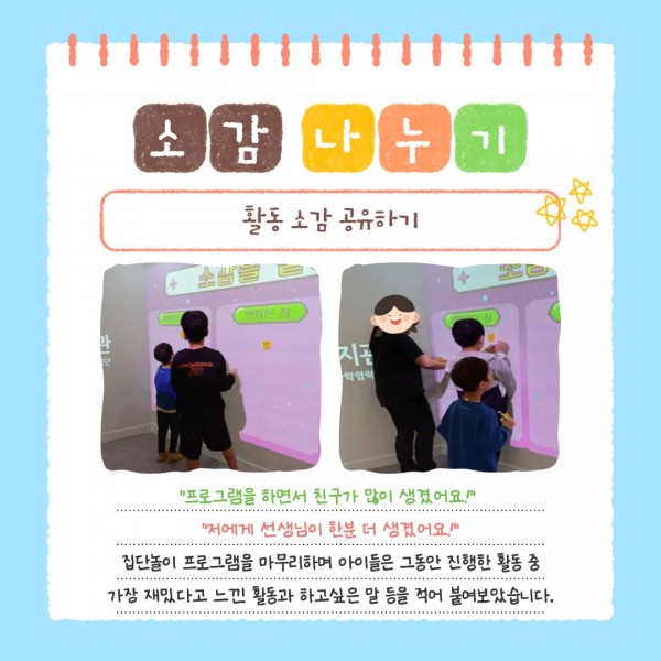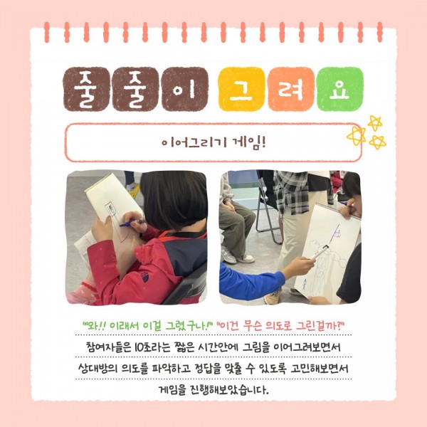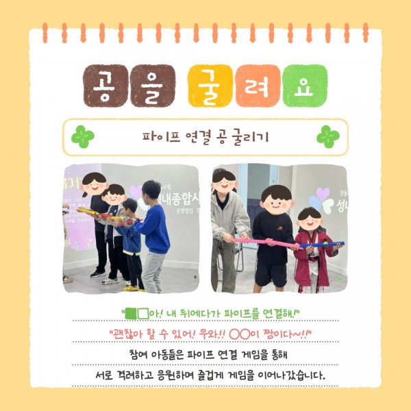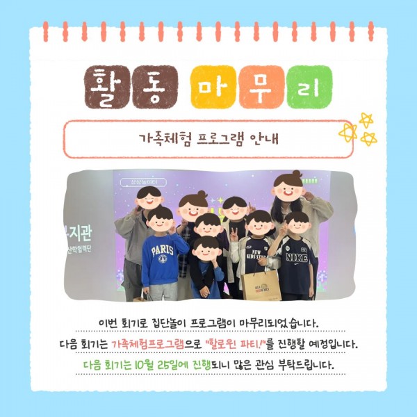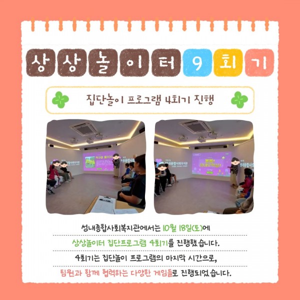 2025년 상상놀이터 집단놀이 프로그램 4회기 진행 페이지 정보 작성자최고관리자 조회조회 : 29회 작성일 25-10-25 14:44 본문 안녕하세요.2025년 10월 18일(토) 성내종합사회복지관에서는관 내 4층 비전상상터에서 상상놀이터 집단놀이 프로그램 4회기를 진행했습니다.자세한 내용은 카드뉴스를 참고해주세요~!요. 목록
