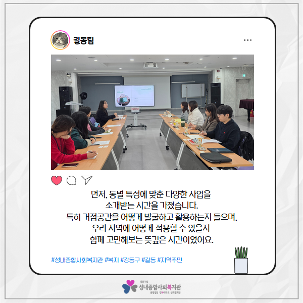 지역밀착형 사업과 중장년 1인 가구 대상 사업에 대해 고민하고 공부하는 뜻깊은 시간이었는데요,