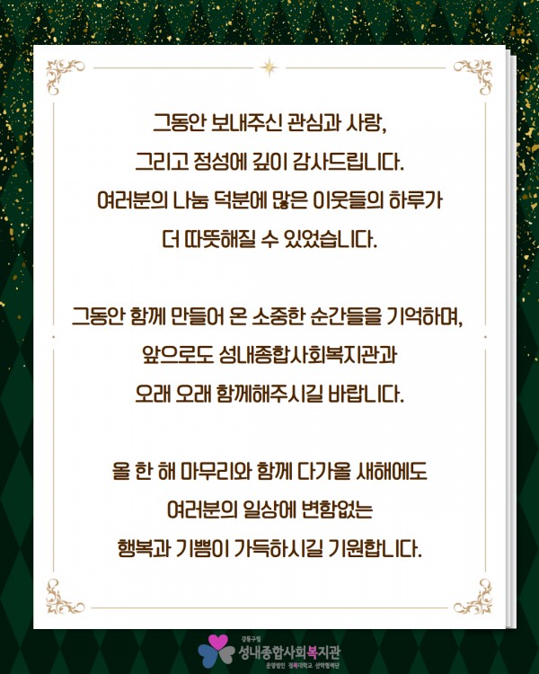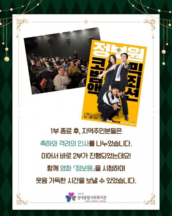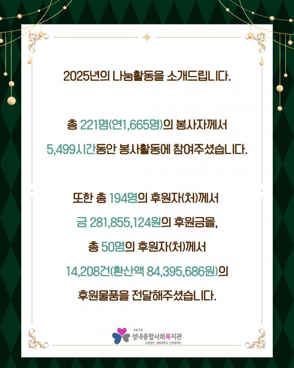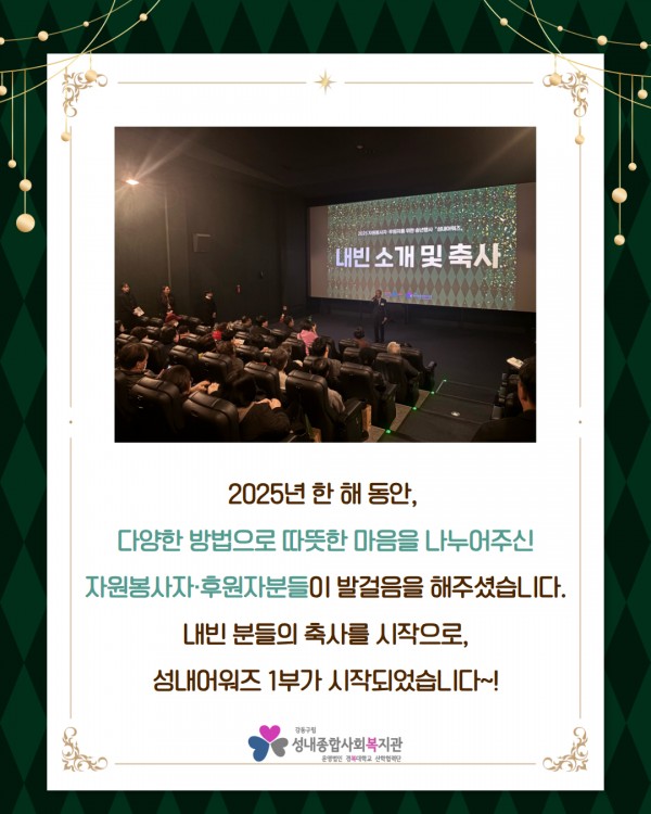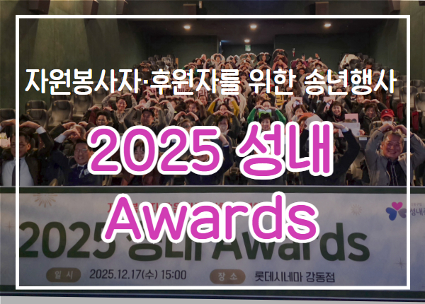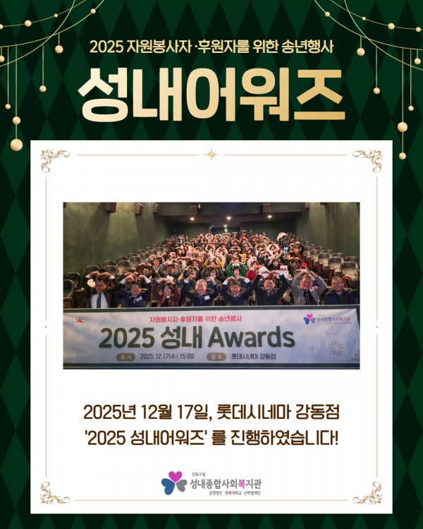 자원봉사자·후원자를 위한 송년행사 '2025 성내Awards' 진행 페이지 정보 작성자최고관리자 조회조회 : 39회 작성일 25-12-19 13:20 본문 안녕하세요. 성내종합사회복지관입니다.2025년 12월 17일, 자원봉사자·후원자를 위한 송년행사, '2025 성내Awards'를 진행했습니다.한 해동안 지역주민을 위해 따뜻한 마음을 나눠주신 여러분께 감사드립니다.자세한 내용은 아래 카드뉴스를 확인해주세요! 목록