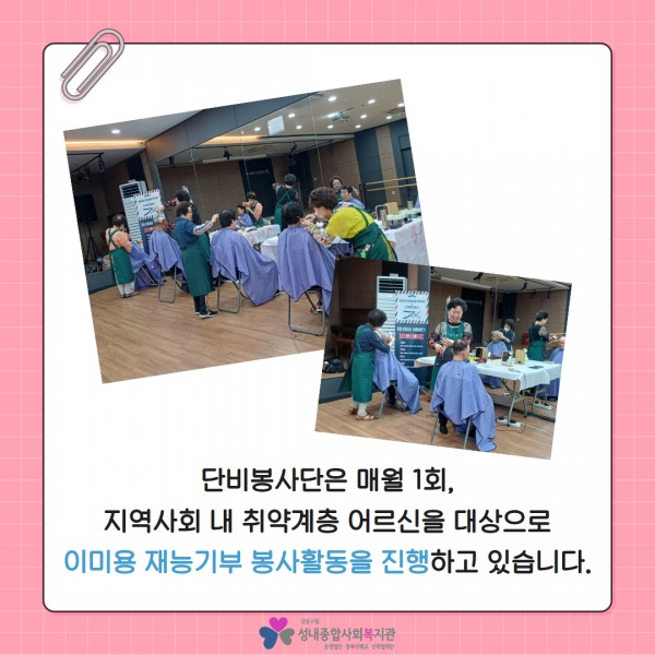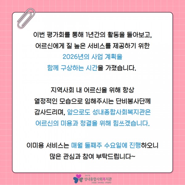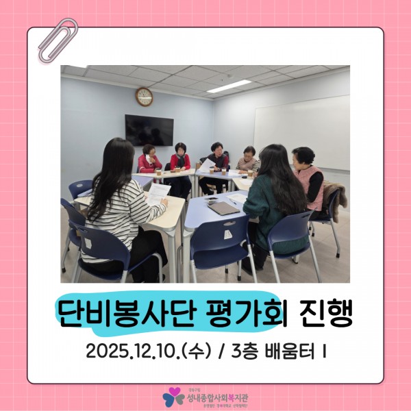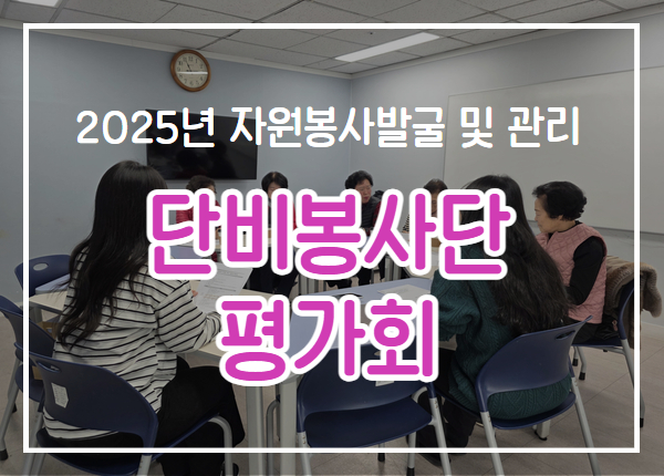 2025년 자원봉사관리 및 개발 '단비봉사단 평가회' 진행 페이지 정보 작성자최고관리자 조회조회 : 19회 작성일 25-12-23 16:11 본문 안녕하세요. 성내종합사회복지관입니다. 지난 12월 10일, 단비봉사단 평가회를 진행하였습니다.자세한 내용은 아래 카드뉴스를 참고해주세요~! 목록