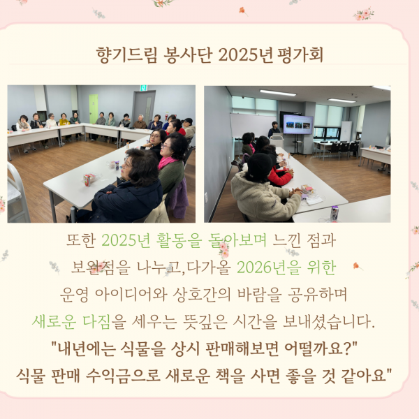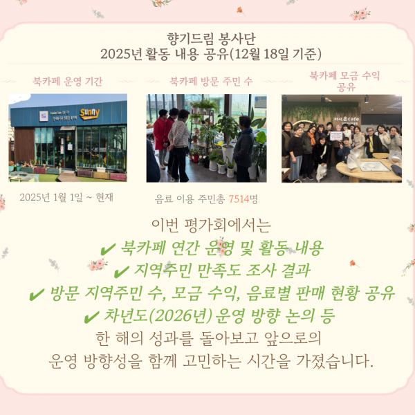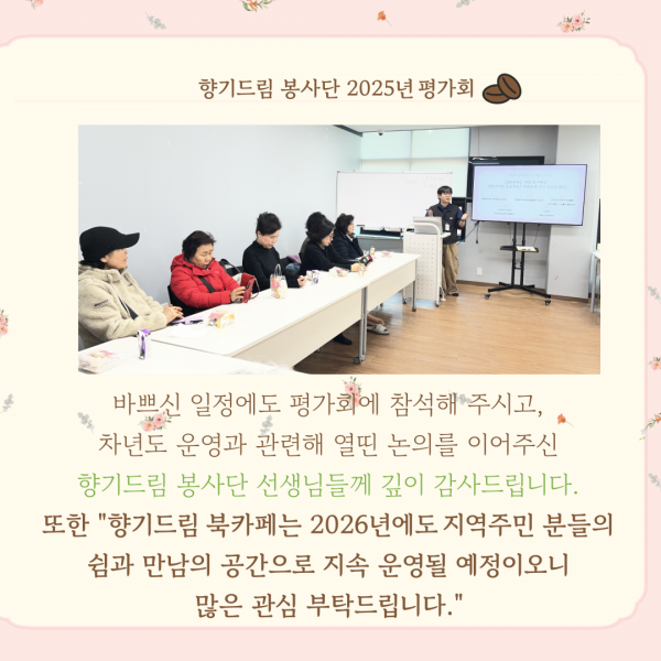 2025년 향기드림 봉사단 평가회 진행 페이지 정보 작성자최고관리자 조회조회 : 42회 작성일 25-12-23 20:07 본문 2025년 12월 19일(금) 향기드림 봉사단 선생님들과 함께 1년간의 활동을 마무리하는 평가회 시간을 가졌습니다.2025년에는(12/23일 기준) 약 7,600명의 지역주민분들이 향기드림 북카페를 방문해주셨는데요~더 맛있고, 더 예쁜 북카페를 만들기 위해 항상 노력하시는 향기드림 봉사단 선생님들과 이용해주시는 지역주민분들 모두에게 감사드리며,앞으로도 많은 관심 부탁드립니다! 목록