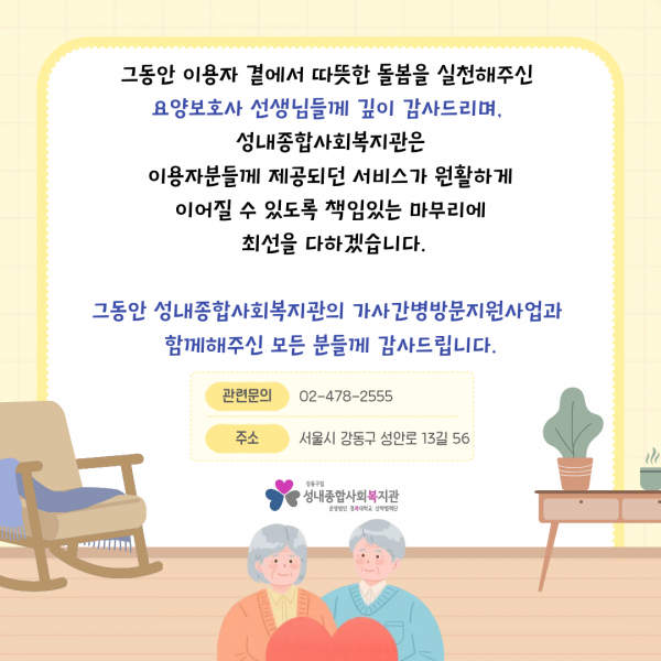 2025 가사간병 방문지원사업 하반기 요양보호사 간담회 실시 페이지 정보 작성자최고관리자 조회조회 : 20회 작성일 25-12-26 17:11 본문 성내종합사회복지관은 2025년 12월 24일, 가사·간병방문지원사업 하반기 요양보호사 간담회를 실시하였습니다. 2012년부터 지역사회 돌봄을 이어온 성내종합사회복지관의 가사·간병방문지원사업은2025년 12월을 끝으로 그동안의 긴 여정을 마무리하게 되었음을 알려드립니다. 자세한 내용은 아래 카드뉴스를 확인해주세요! 목록