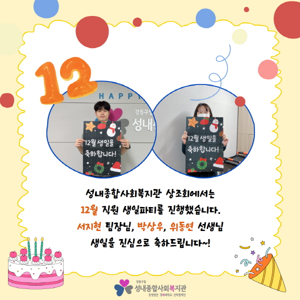 성내종합사회복지관 상조회 2025년 12월 직원 생일파티&선물뽑기 이벤트 페이지 정보 작성자최고관리자 조회조회 : 145회 작성일 25-12-30 10:31 본문 2025년 12월 생일을 맞은 서지현 팀장님, 박상우, 위동연 선생님 진심으로 축하드립니다! 목록