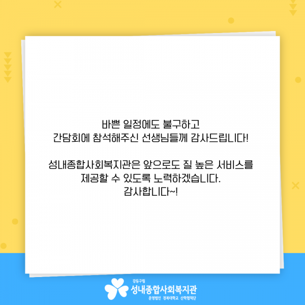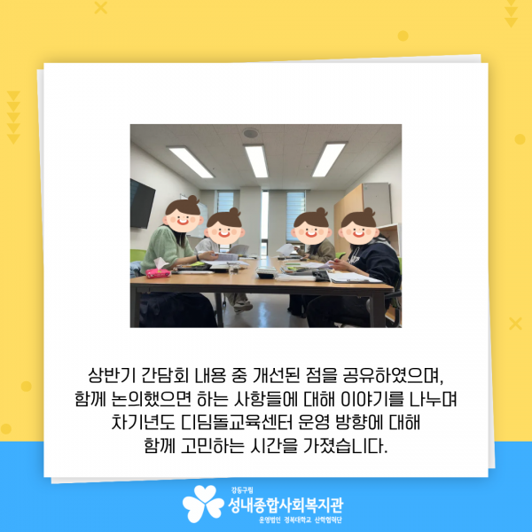 2025년 디딤돌교육센터 하반기 치료사 간담회 페이지 정보 작성자최고관리자 조회조회 : 80회 작성일 25-12-31 18:49 본문 12. 22. ~ 12. 26.(금) 성내종합사회복지관 디딤돌교육센터의 원활한 운영을 위해치료사 선생님들의 의견을 듣고 함께 운영 방향을 고민해보는 간담회를 진행하였습니다.바쁜 일정에도 불구하고 센터 운영을 위해 한자리에 모여주신 치료사 선생님들께 감사드리며,앞으로도 유익한 치료로 아이들과 함께 성장해나가는 디딤돌교육센터가 되도록 더욱 노력하겠습니다. ♥ 목록