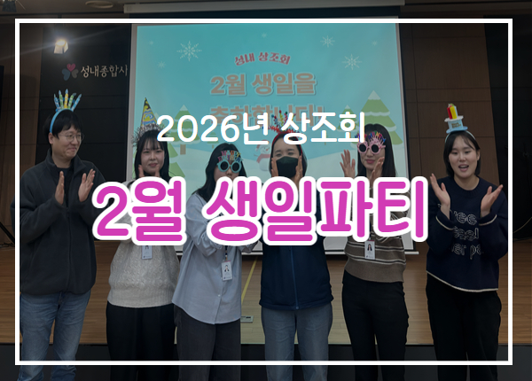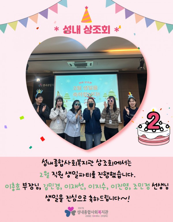 성내종합사회복지관 상조회 2026년 2월 직원 생일파티 페이지 정보 작성자최고관리자 조회조회 : 24회 작성일 26-02-04 13:13 본문 2026년 2월 생일을 맞으신이충효 부장님, 김민경, 이재선, 이지수, 이진영, 조민정 선생님 진심으로 축하드립니다! 목록