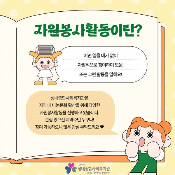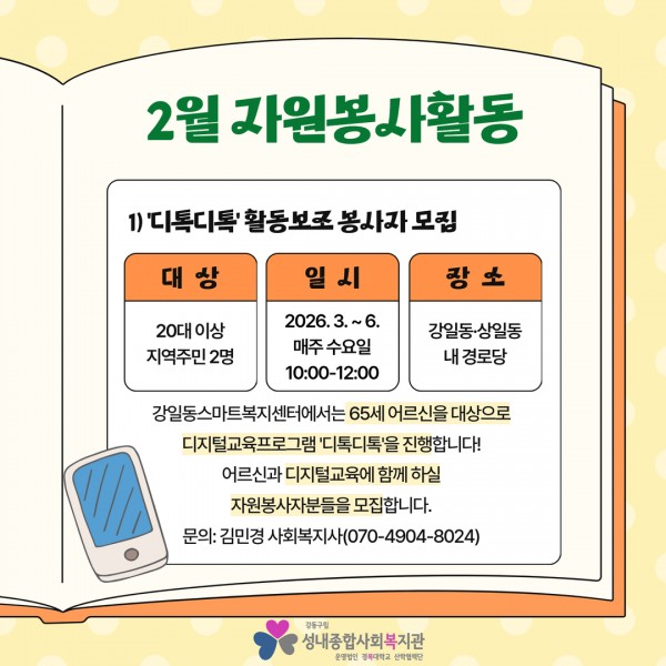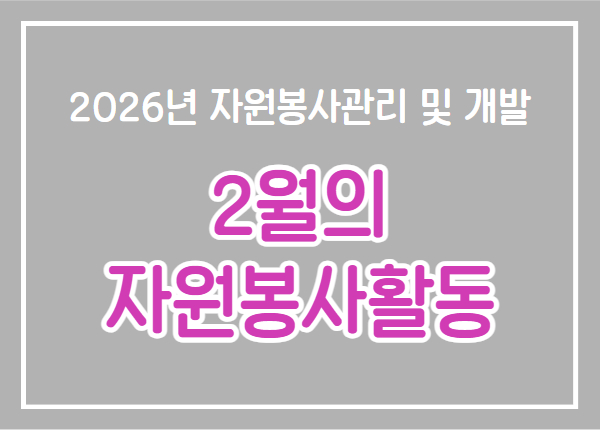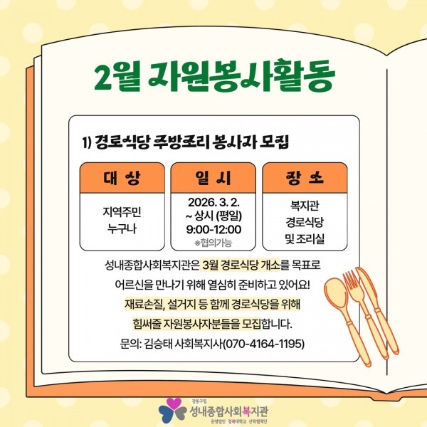 2026년 2월 자원봉사활동 안내 페이지 정보 작성자최고관리자 조회조회 : 26회 작성일 26-02-09 18:08 본문 안녕하세요. 성내종합사회복지관입니다.2026년 2월 모집 중인 자원봉사활동을 소개합니다!지역주민분들의 많은 관심 부탁드리며, 자세한 내용은아래 카드뉴스를 확인해주세요!신청: VMS홈페이지 및 유선연락(02-478-2555) 목록